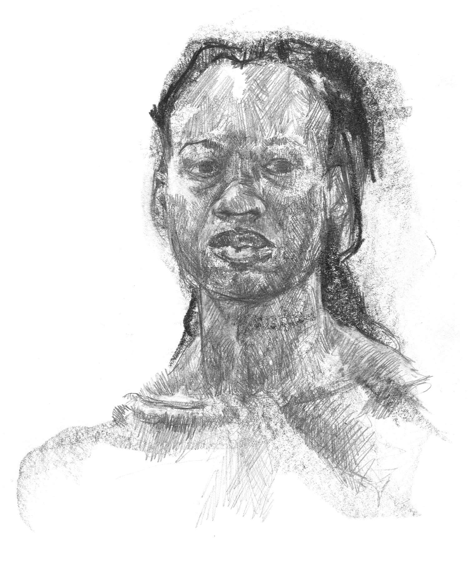 It could be the hairstyle, constant side eye, or the pierced lip, but she has crafted an unmistakable punk vibe in my sketchbooks. It comes through in all versions of her portrait. I've noticed a wide range of looks, but the vibe is always there.