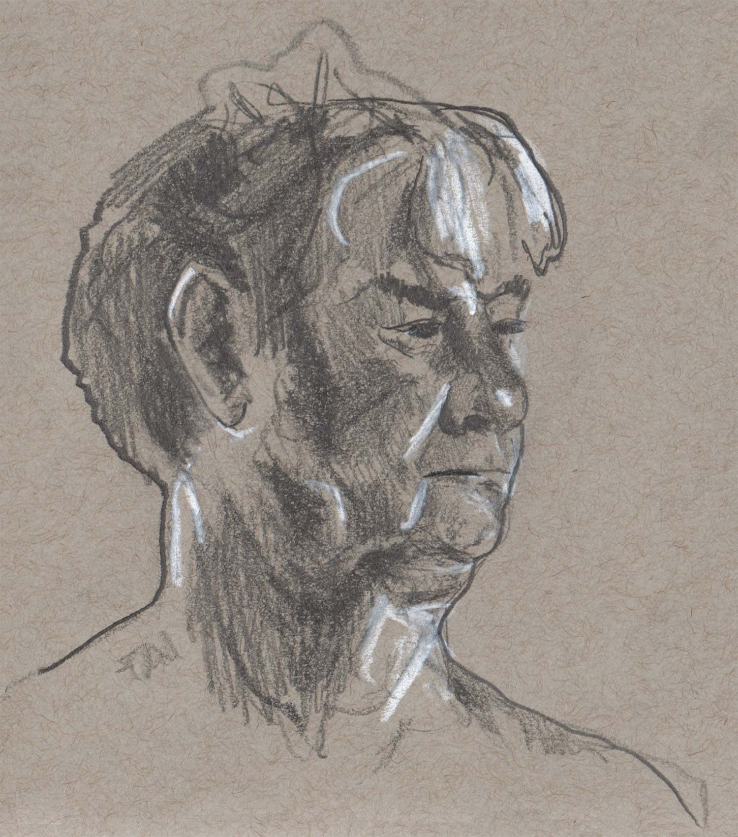 In the first drawing, the chin looks small, with less heavy cheeks. But in the others, the chin and fuller cheeks help unify the portraits. He was a great sport with me staring at his face for a few hours.