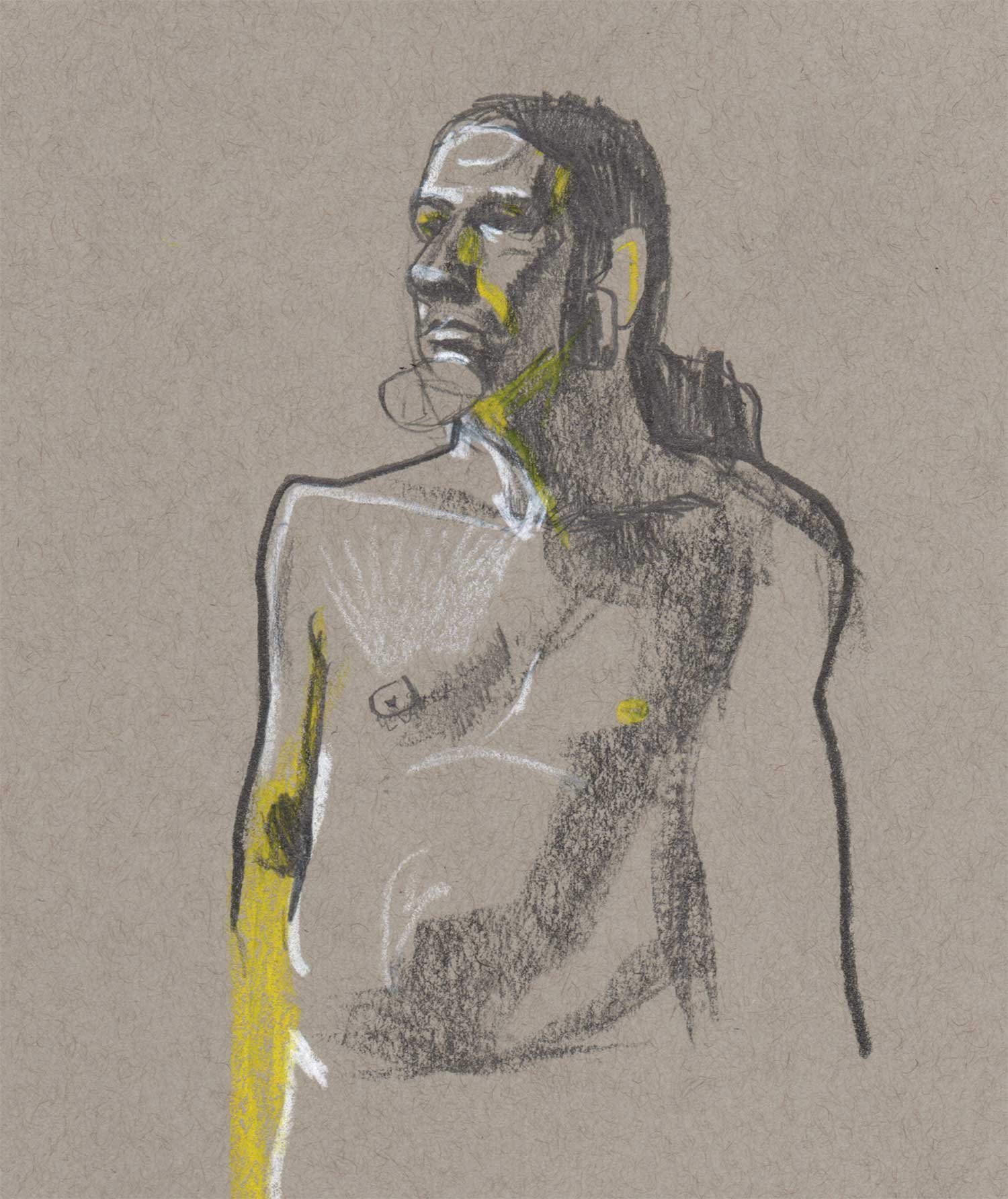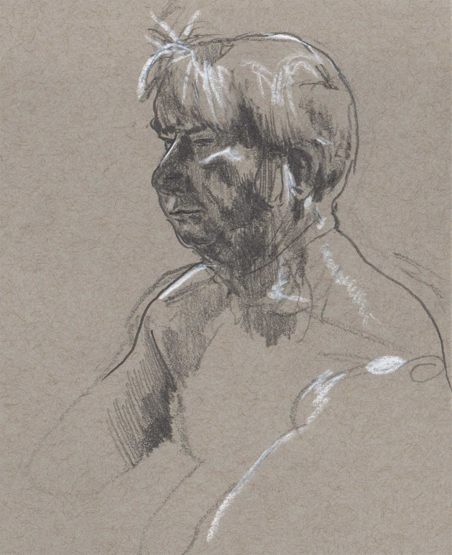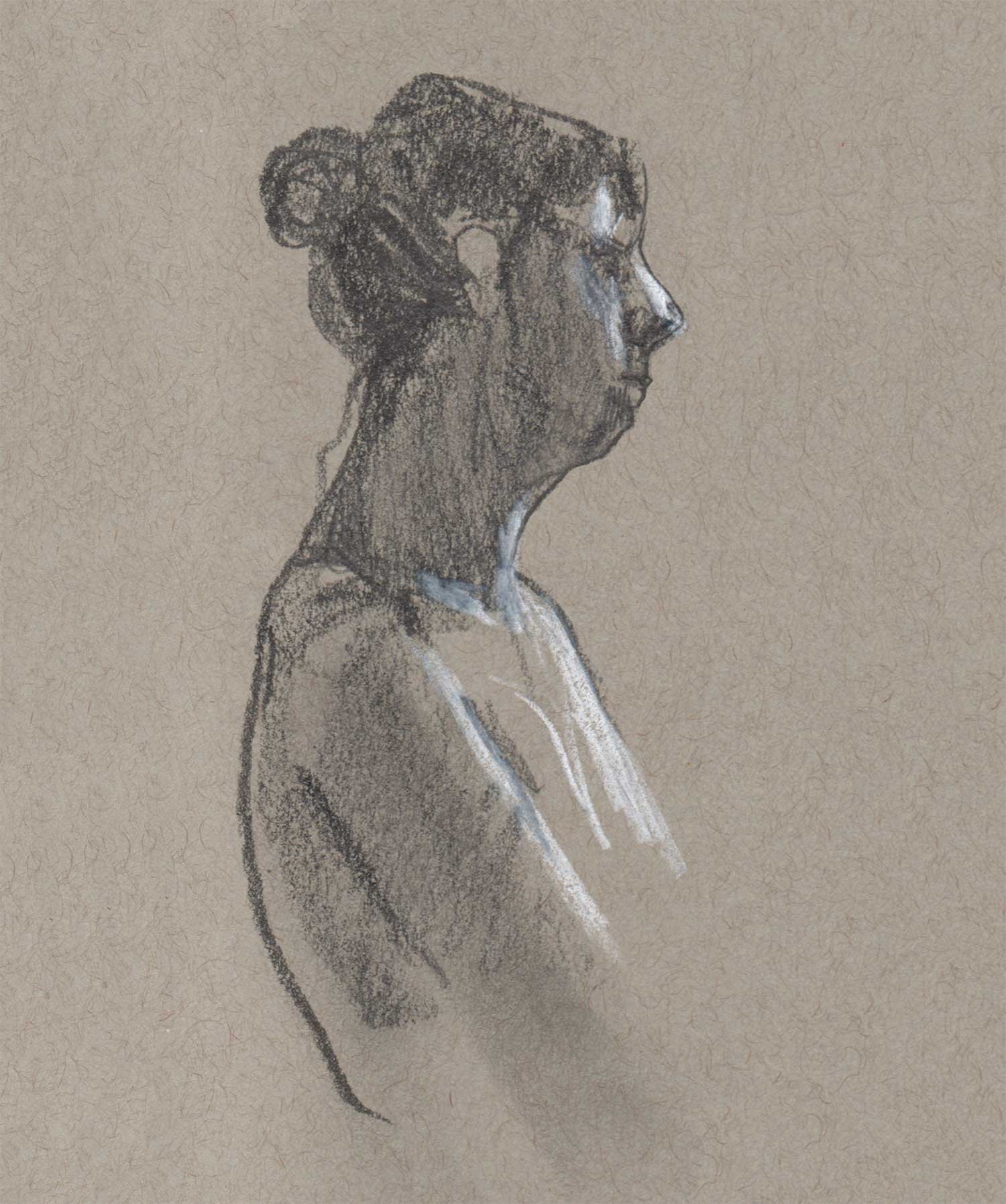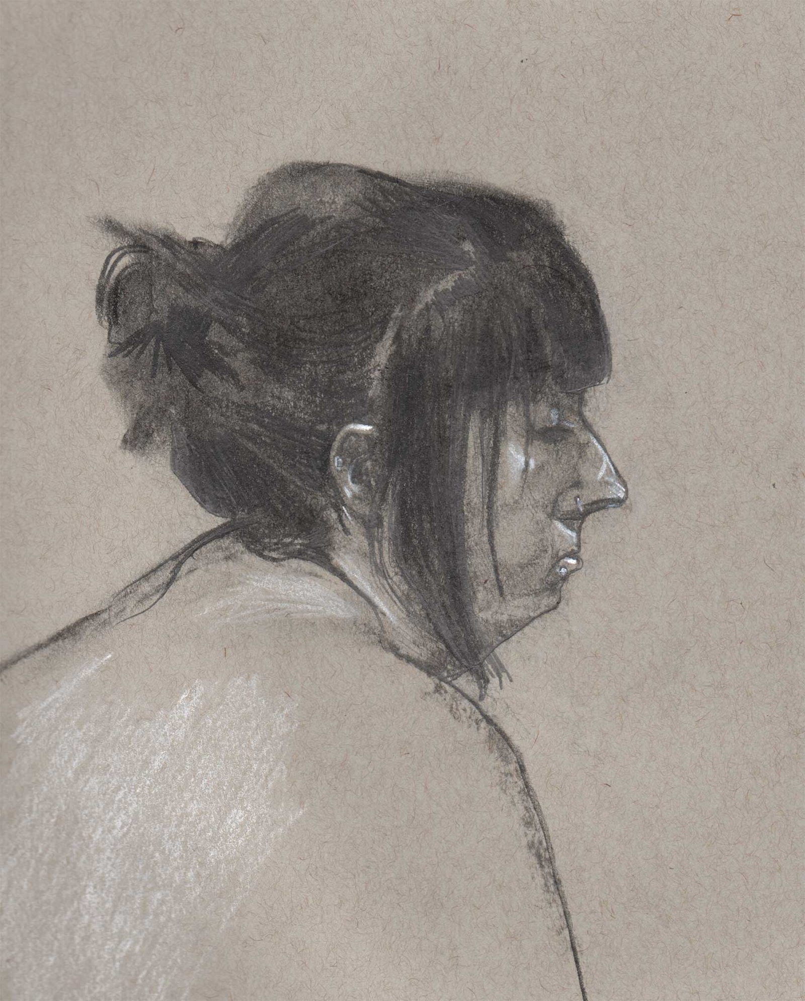 Drawing on a colored paper is a very different process than a white paper. I prefer to use charcoal or graphite to build up tones from white. Starting from a mid-tone is new and forces me to think differently about the whole drawing.