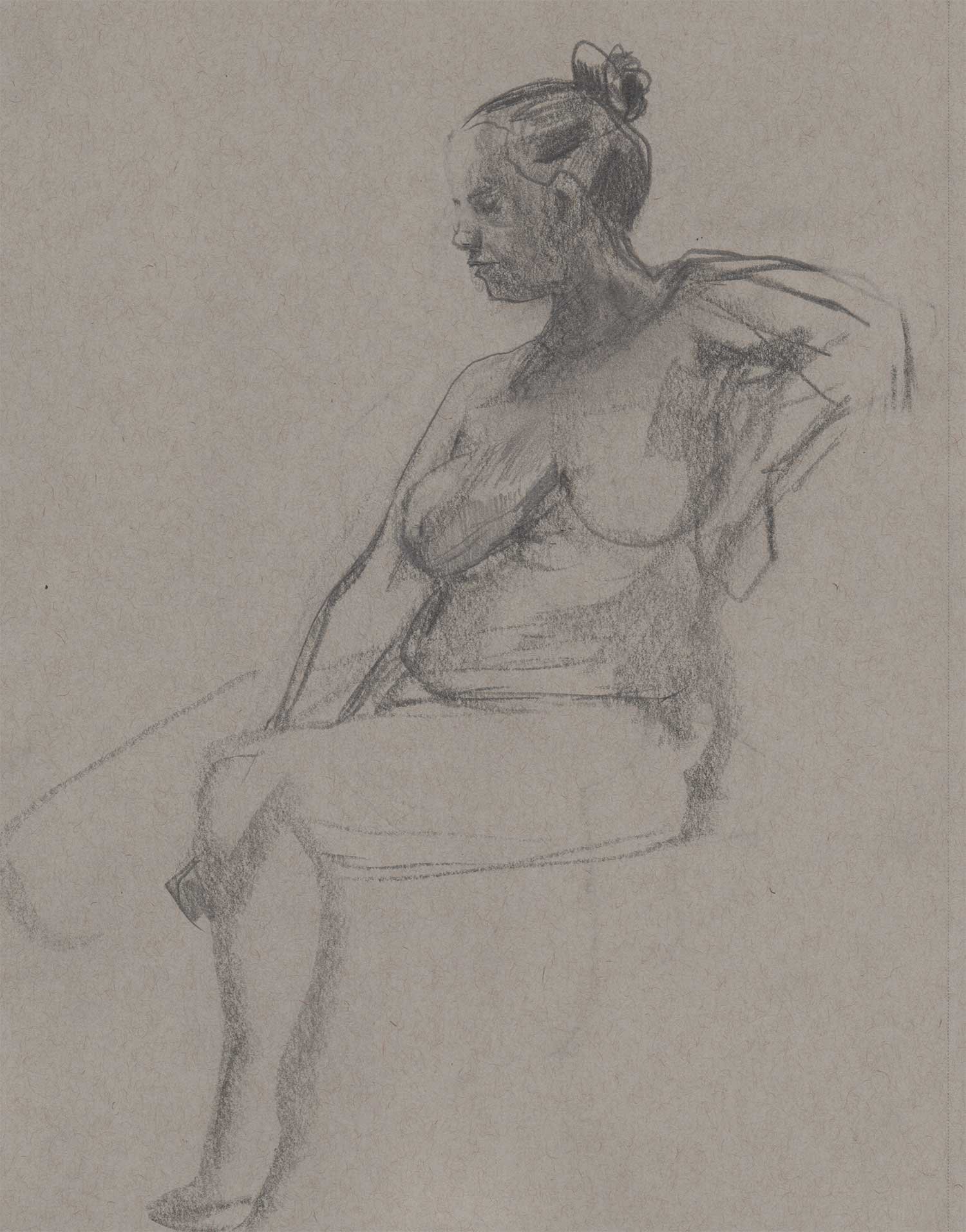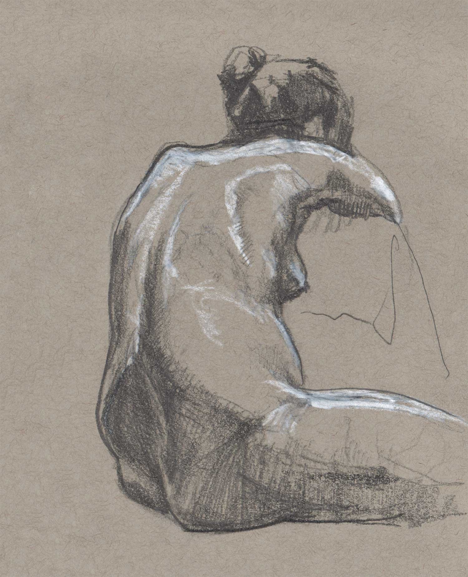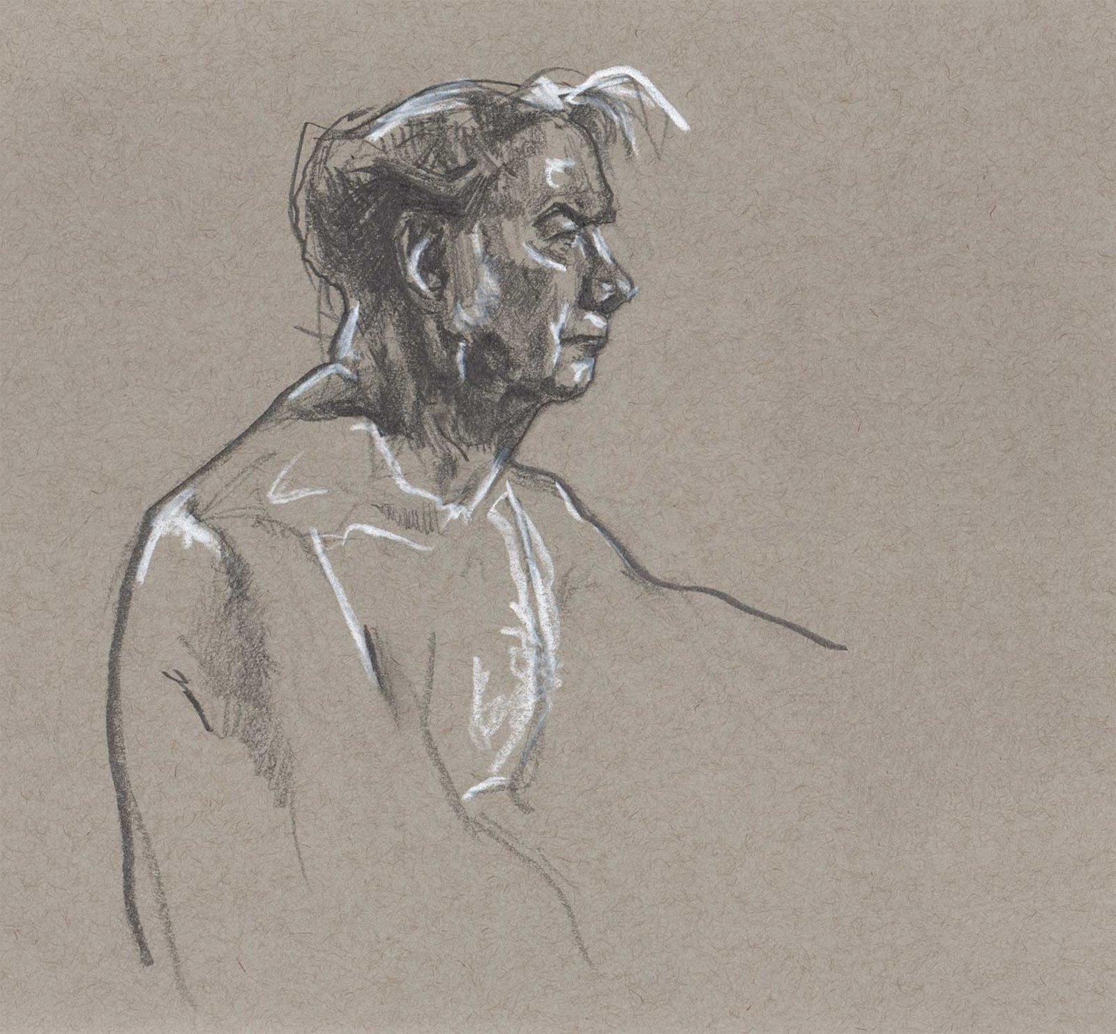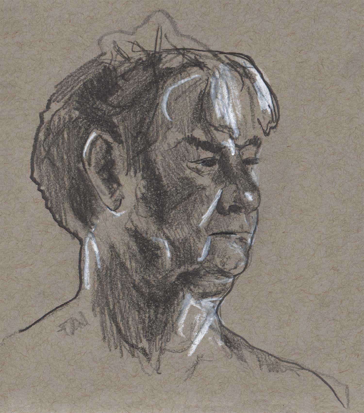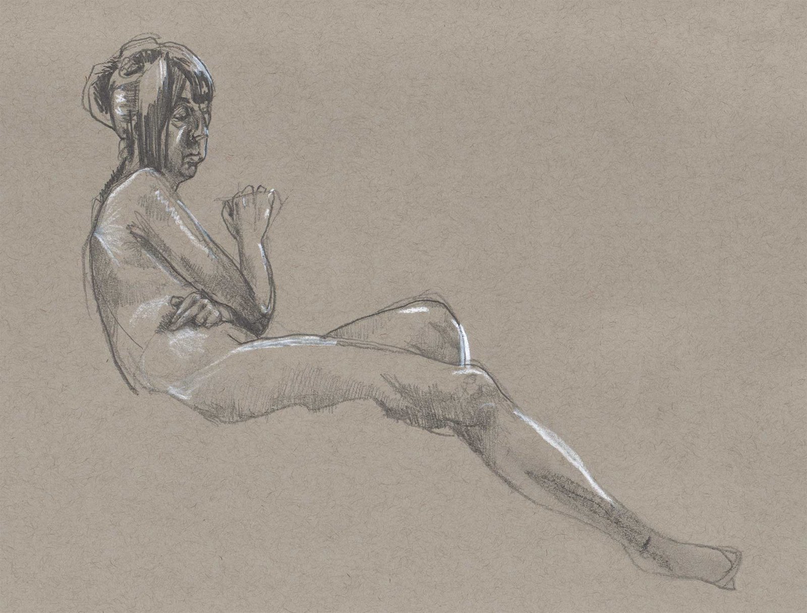 Drawing on a colored paper is a very different process than a white paper. I prefer to use charcoal or graphite to build up tones from white. Starting from a mid-tone is new and forces me to think differently about the whole drawing.