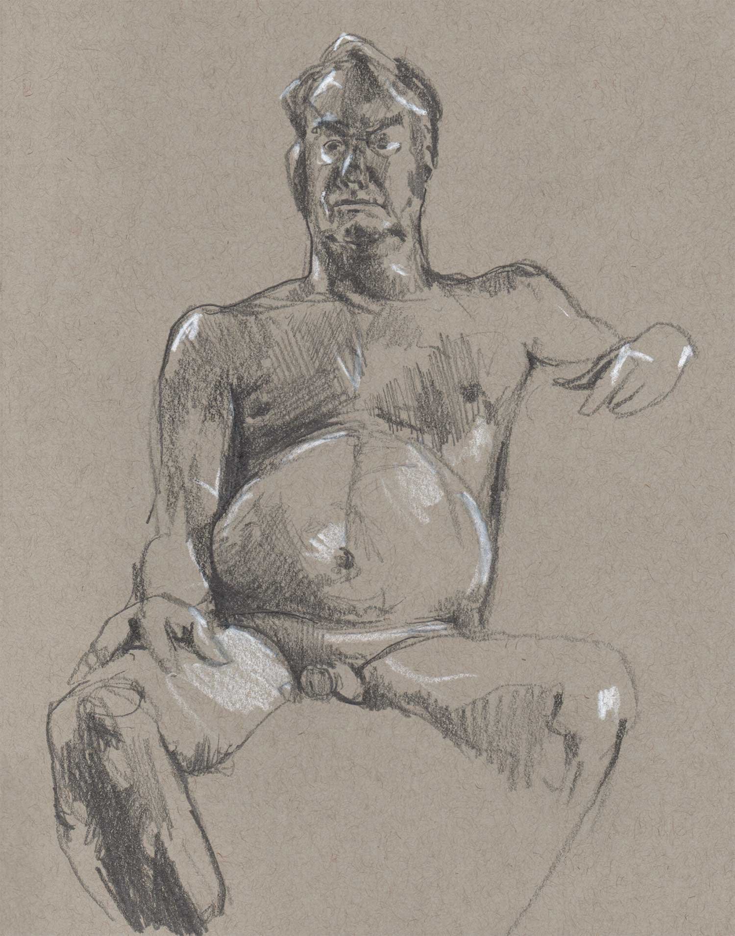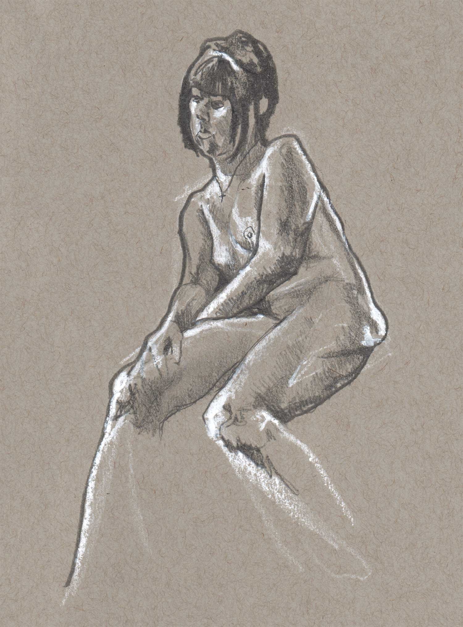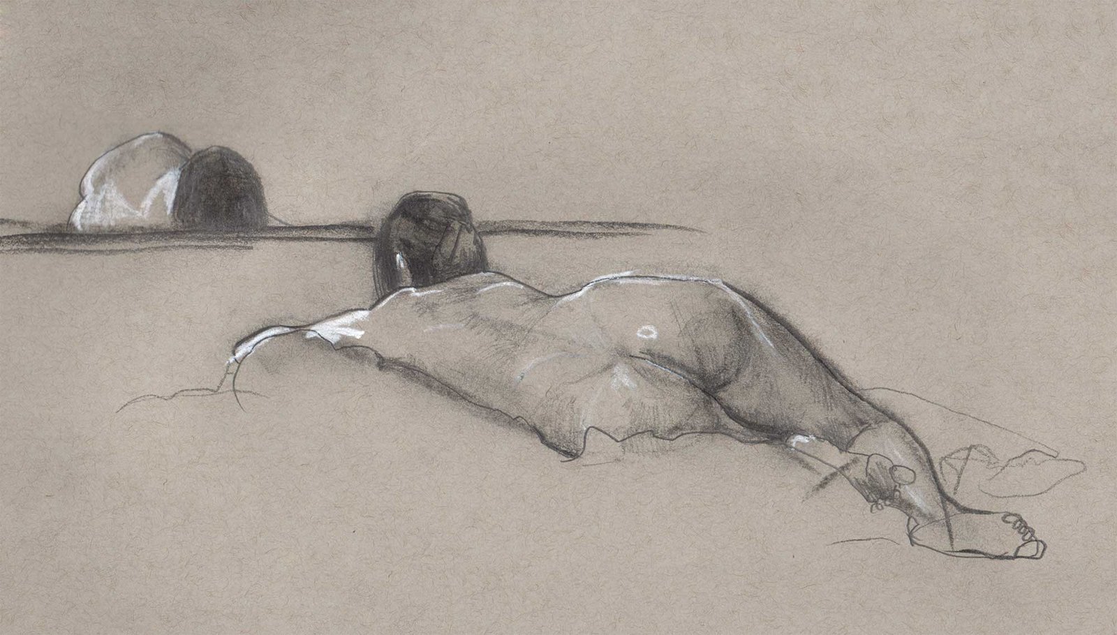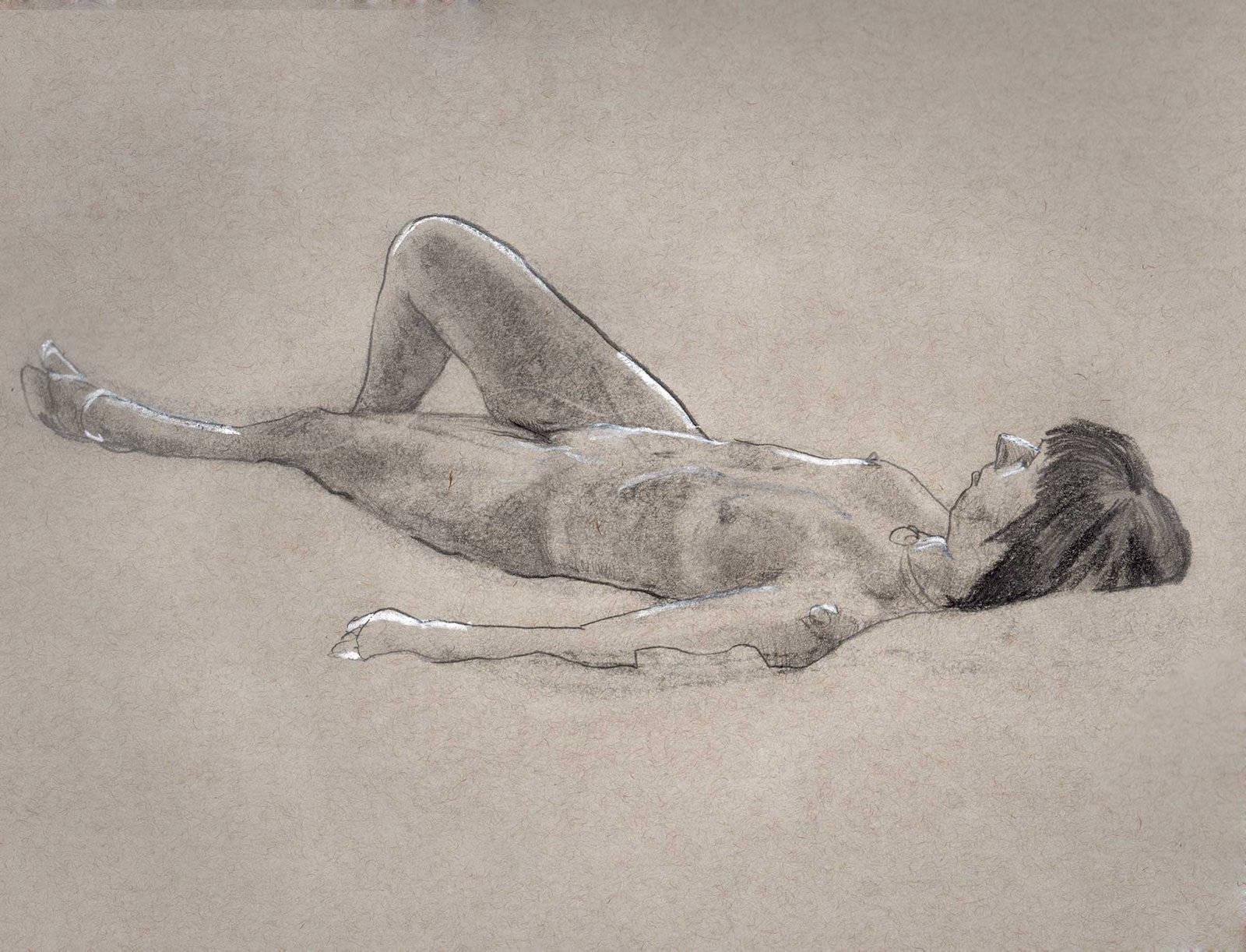 Drawing on a colored paper is a very different process than a white paper. I prefer to use charcoal or graphite to build up tones from white. Starting from a mid-tone is new and forces me to think differently about the whole drawing.