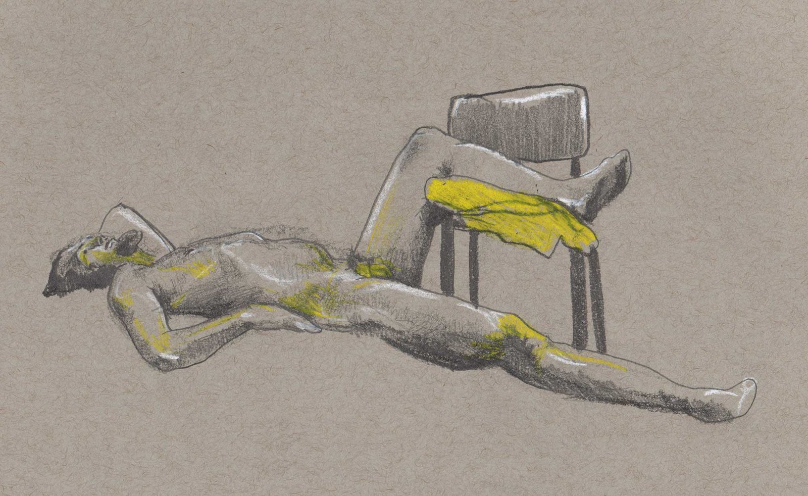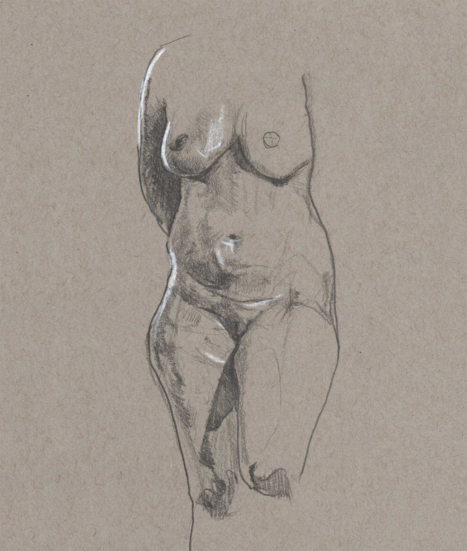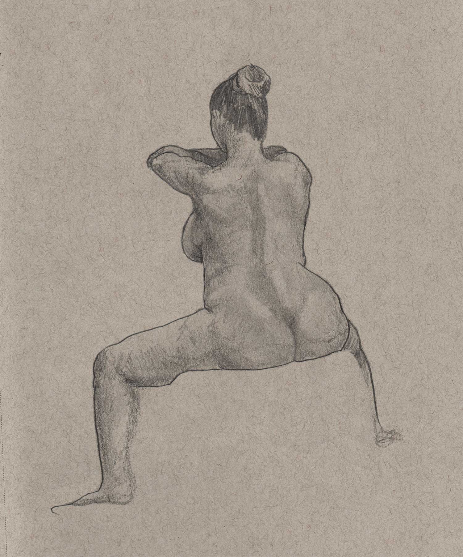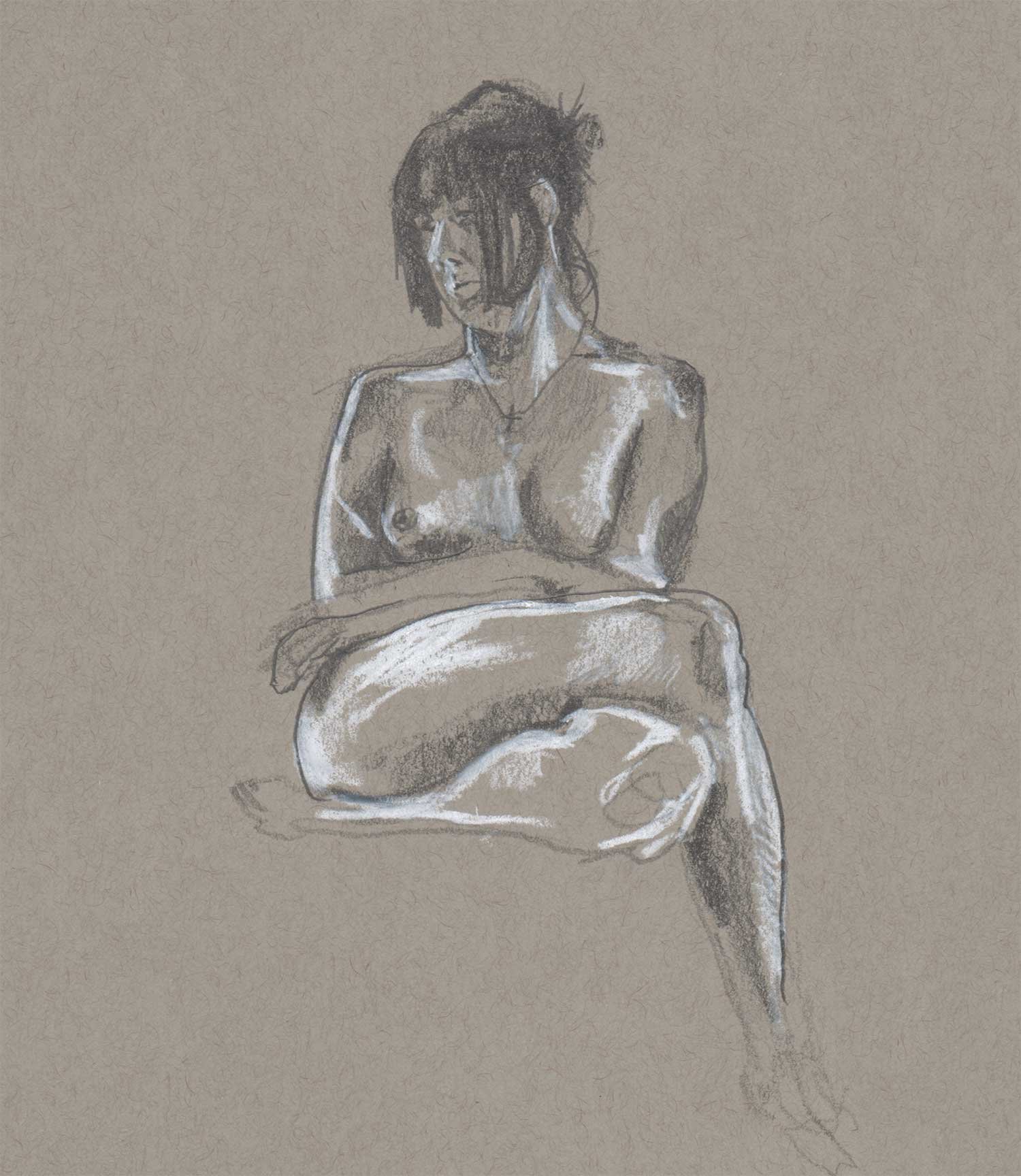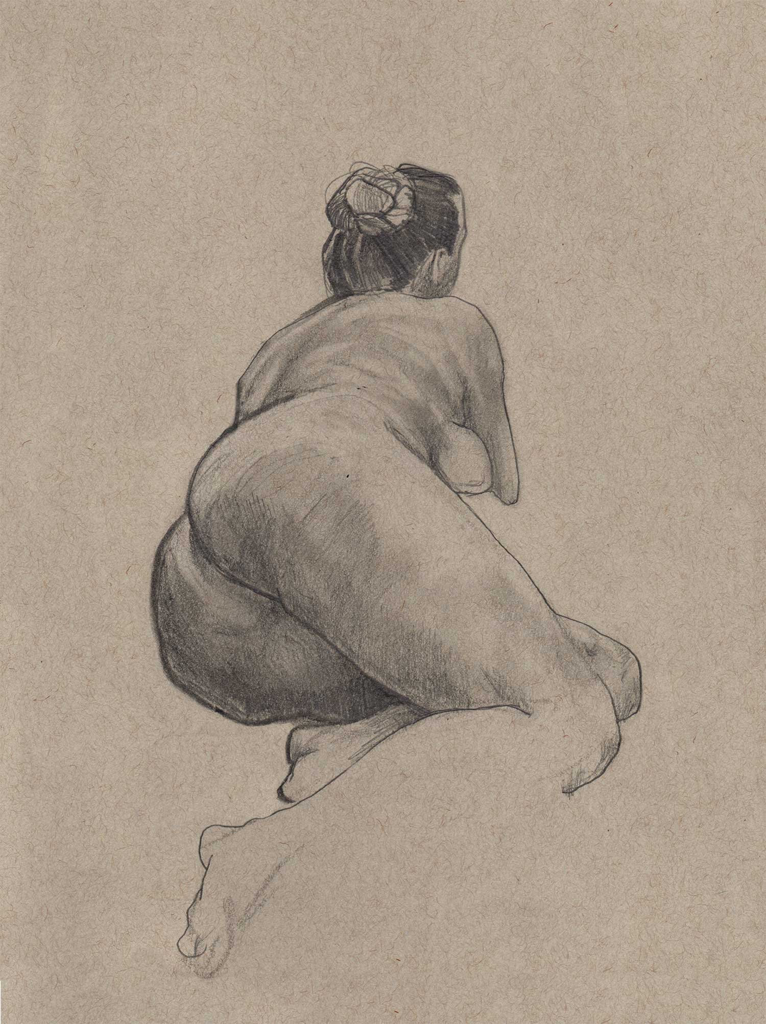 Drawing on a colored paper is a very different process than a white paper. I prefer to use charcoal or graphite to build up tones from white. Starting from a mid-tone is new and forces me to think differently about the whole drawing.