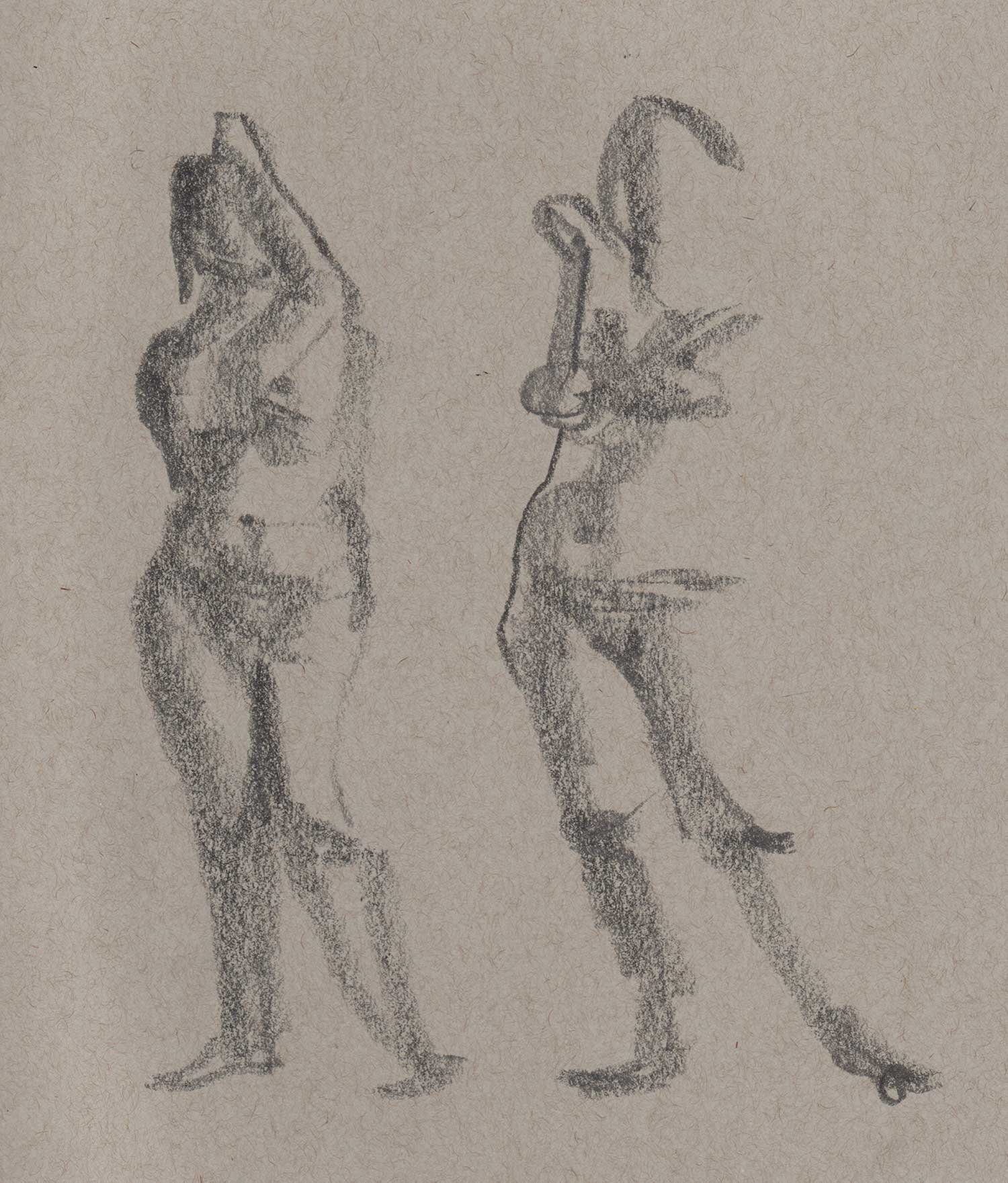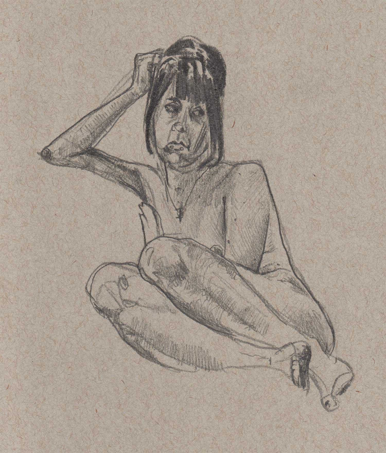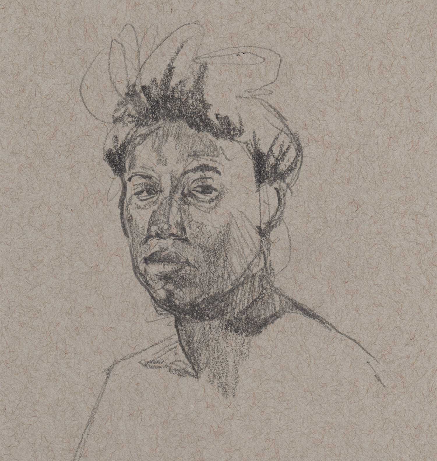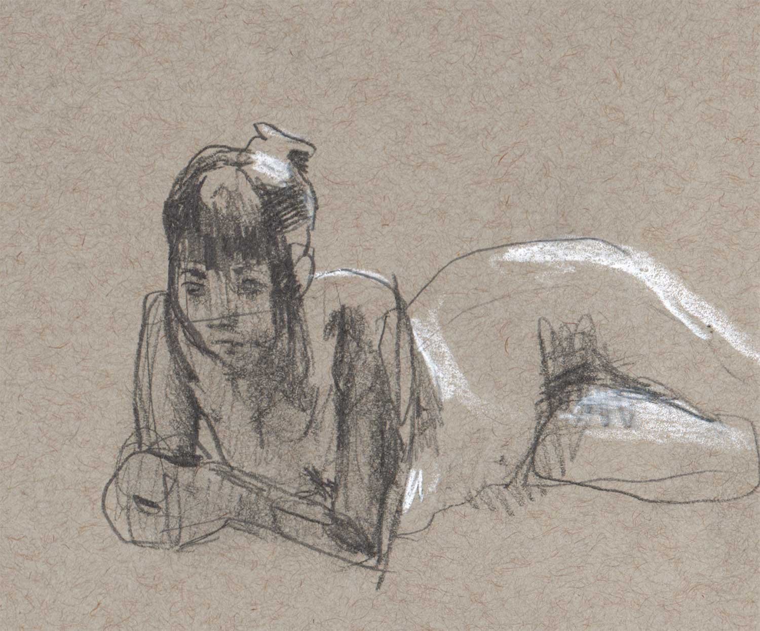 Drawing on a colored paper is a very different process than a white paper. I prefer to use charcoal or graphite to build up tones from white. Starting from a mid-tone is new and forces me to think differently about the whole drawing.